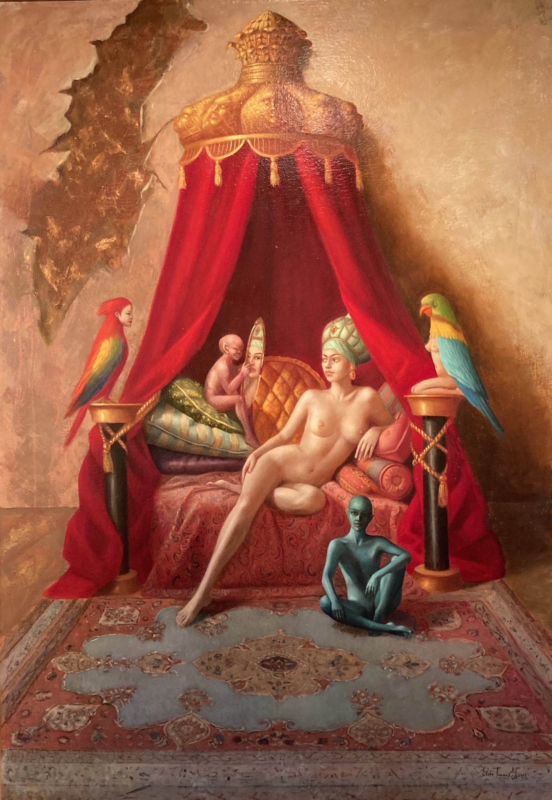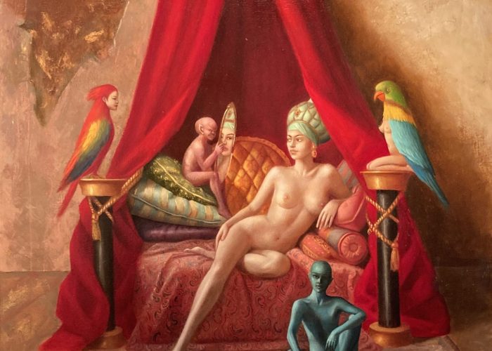 L’artista ama circoscrivere circostanze, luoghi e stati d’animo che scongiurano la noia, a volte consumati nell’armonia di cieli pervasi di un chiarore raffaellesco, possibilista e irrimediabilmente radioso, altre scene sbucano e irrompono dai fondali neri di evidente impronta caravaggesca. E nell’originale commedia pittorica, come una farsa tremendamente vera e autentica, s’impone il rosso, leitmotiv suscettibile di sensuali orpelli e accessori, chiamato a creare quell’eros e quella estrema voluttà da far dimenticare la tragedia che in esso si cela, anzi se ne distrae invaghiti dalla sovranità immaginifica che sfida gli accadimenti per porsi al di sopra degli scongiurati eventi.