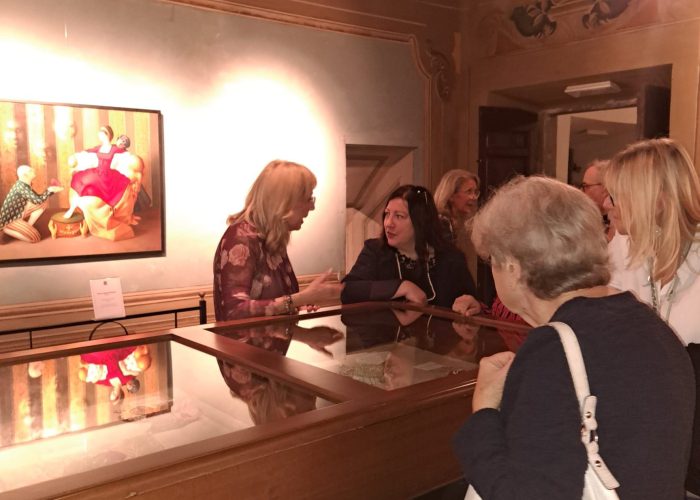 Nell’Atelier della pittrice l’occhio s’imbizzarrisce, si lascia sedurre dai colori vividi, brillanti e festosi. E accade che nelle stranezze di atmosfere di un neo-barocco, le architetture riverberino la calda luce romana intenta a intagliare i capricci scultorei, mentre le figure di omini e giullari, di dame e damigelle, se ne lascino scaldare complici e divertite intente a coinvolgere l’altro travolto in una dimensione disimpegnata e disincantata in cui spazio, oggetti e personaggi incarnano messaggi finemente evocativi.