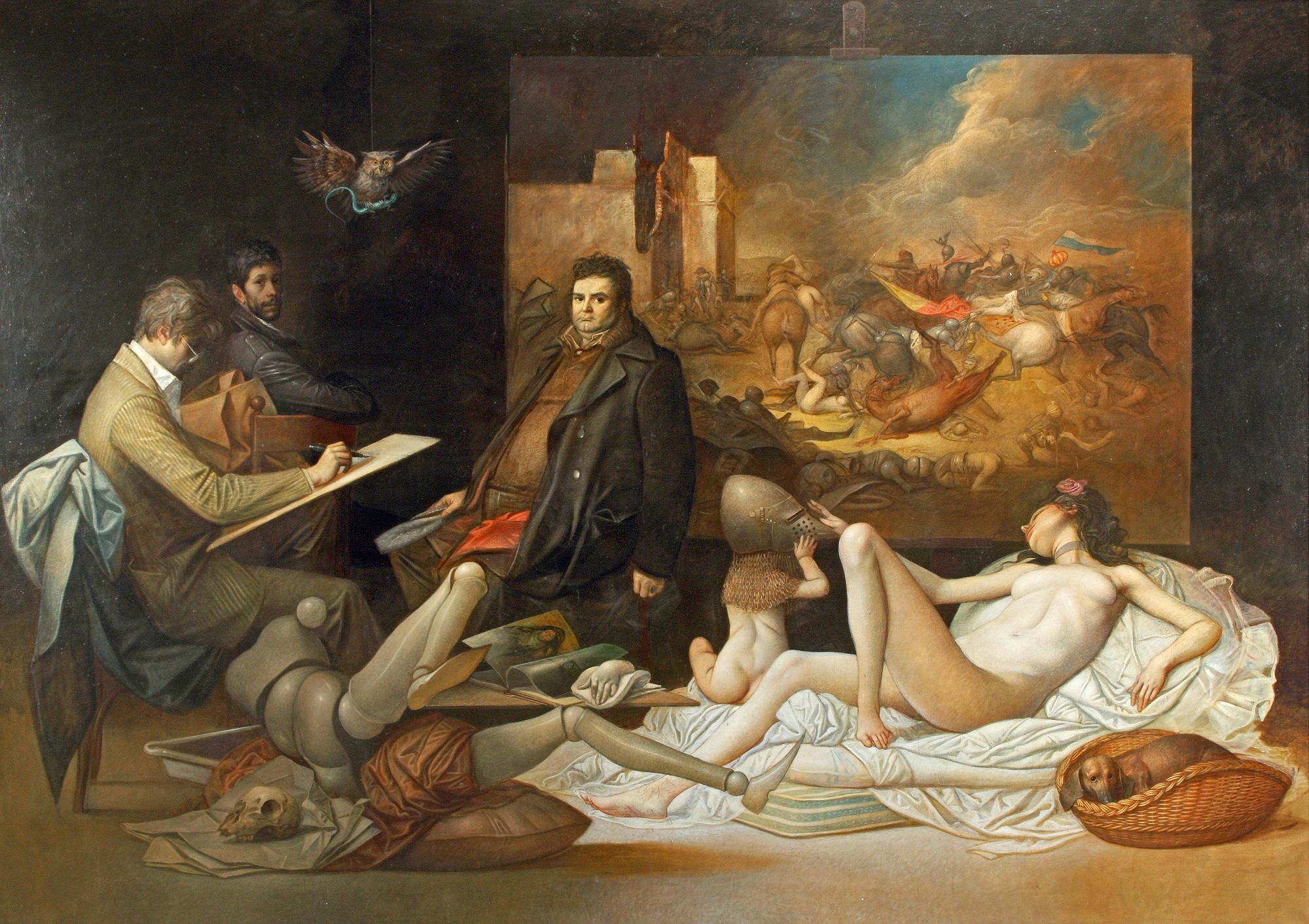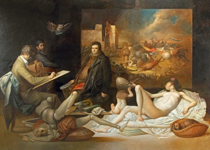 Del resto l’abilità dell’artista sta nel modo in cui riesce ad attualizzare i temi epici, cavallereschi, biblici e filosofici con leggerezza, come un remind incorniciato da accattivanti architetture ora rinascimentali, ora barocche, ora neoclassiche; animate da personaggi realistici o mitologici o immaginifici. Talvolta sono minotauri, centauri e tritoni con movenze parlanti, intenti nella lotta o avviluppati a colonne, a baldacchini, a bucintori e ad altre strane diavolerie pescate nella caldera delle idee e dell’arte. Per questo non difetta di spunti simbolici e minuziosi oggetti di fattura iconografica mascherati e occultati nell’enfasi della teatralità rappresentativa.